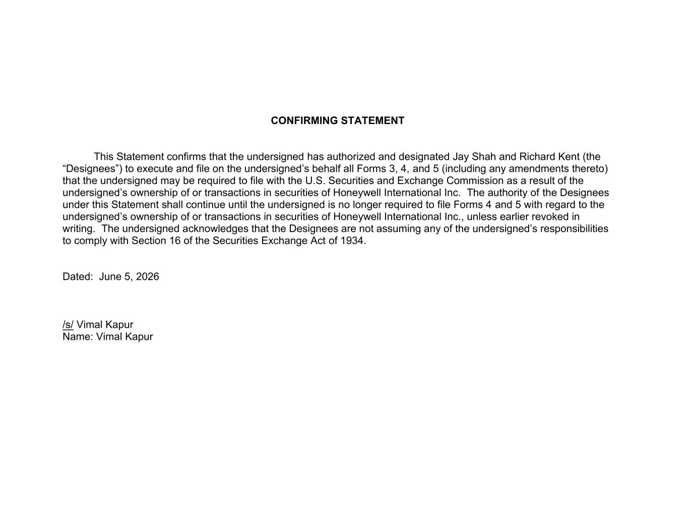 | 4. The Restricted Stock Units were granted under the 2016 Stock Incentive Plan of Honeywell International Inc. and its Affiliates and vest 33%, 33% and 34% on each of February 10, 2025, February 10, 2026 and February 10, 2027, respectively. |