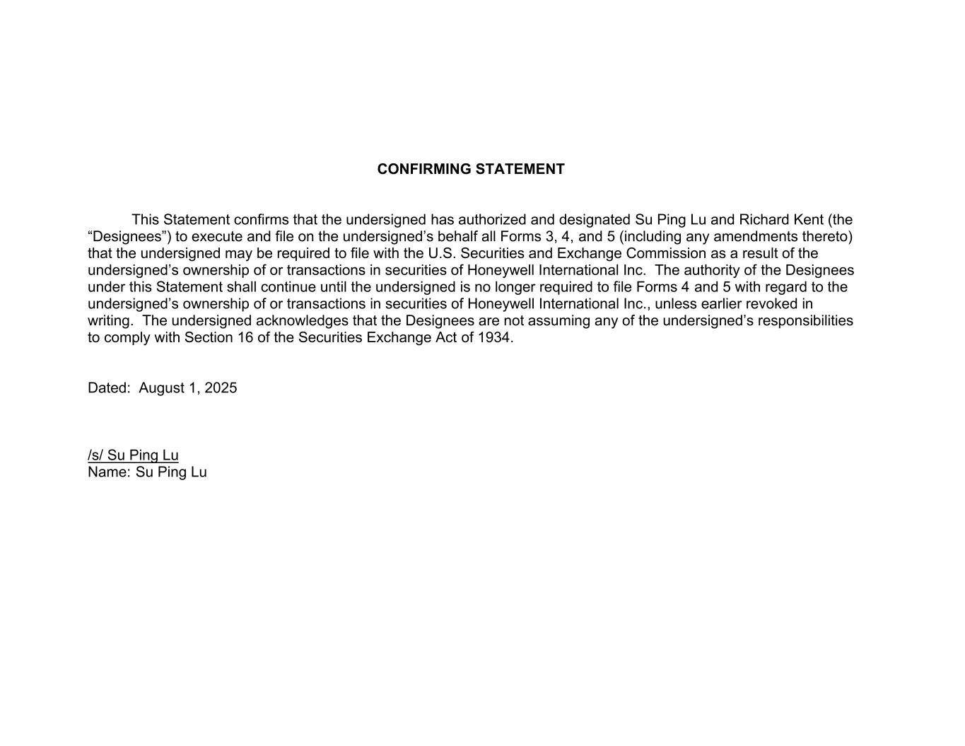| 2. The Restricted Stock Units were granted under the 2016 Stock Incentive Plan of Honeywell International Inc. and its Affiliates and will vest 25% on each of February 19, 2027, February 19, 2028, February 19, 2029 and February 19, 2030, respectively. |